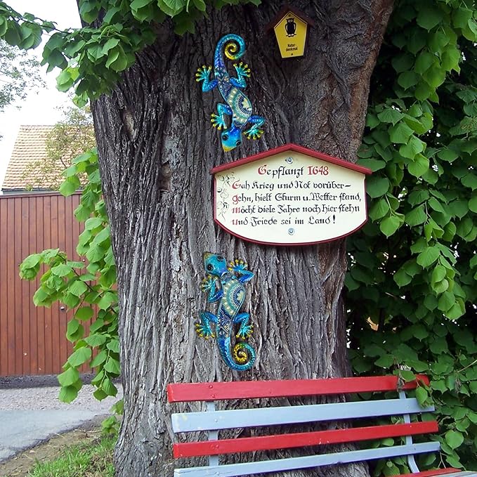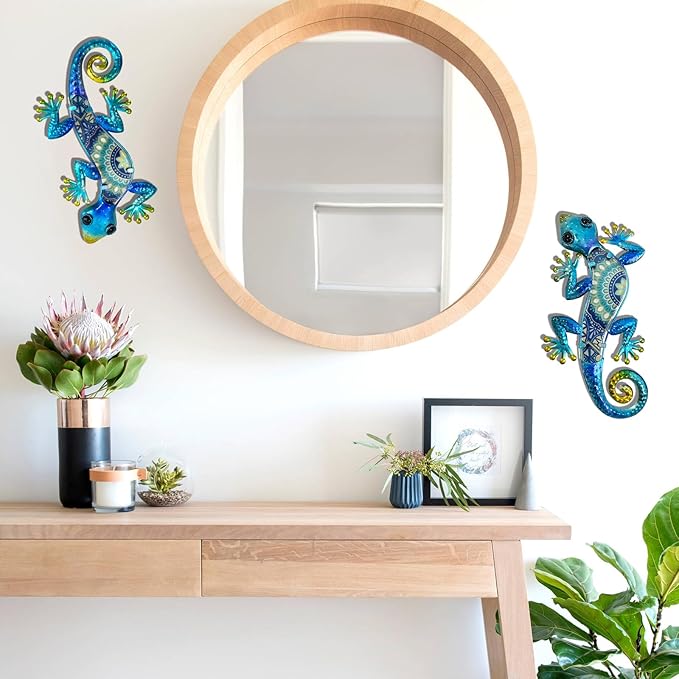 - đŠăDesignă metal lizards outdoor decor measures 12*5.5*0.6 inchïŒsuitable size for any space. Exquisite lizard wall-hanging suit uses Dreamy blue gradient as the main color, with the same color Bohemian pattern, vivid curly tail and 3d eyes, which will bring special decoration to your garden