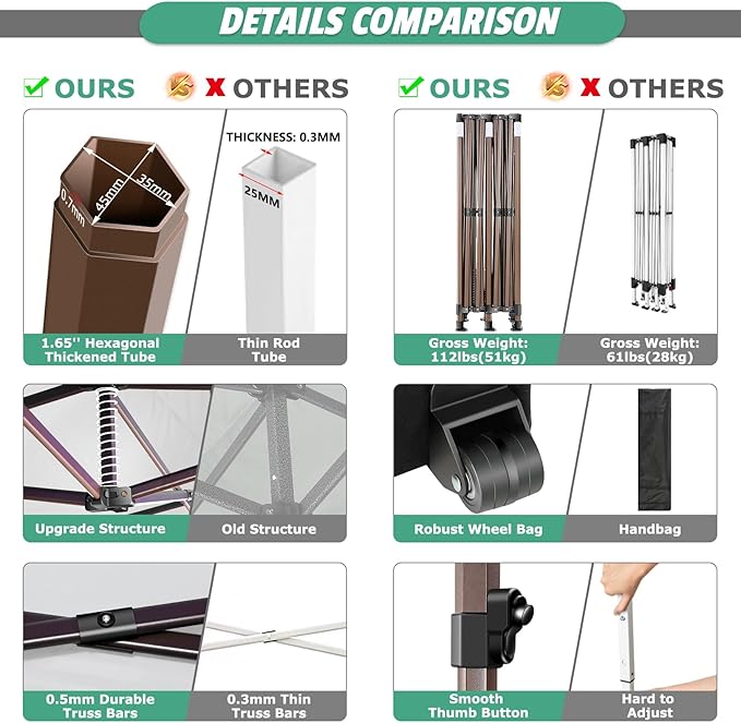 - [Upgrade Heavy Duty Canopy] The COBIZI 10x20 Heavy Duty Canopy features a commercial-grade full truss structure constructed from durable powder-coated stainless steel. The thickness of the 1.77 inch (45mm) hexagonal legs has been increased to 0.7mm/0.03 inches, providing superior stability and durability. Full truss design ensures exceptional sturdiness and rust resistance, capable of withstanding wind speeds of up to 30mph when properly secured with an number of sandbags, ropes, and stakes.