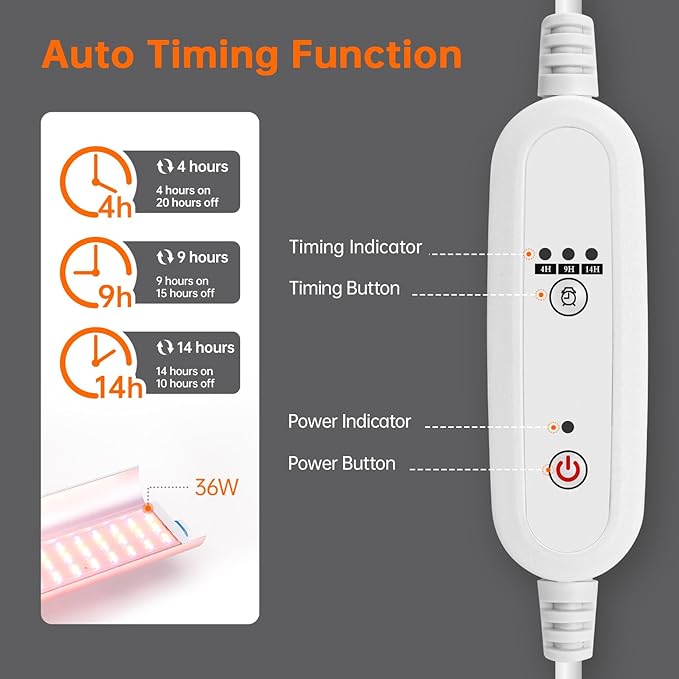 - 【Adjustable Color Light with Timer】Provides optimal light conditions for every growth stage with its three lighting modes(Pink Purple/Yellow/Mix Light) - Seedling, Growing, and Blooming. 4/9/14 timer mode, travel or work without worrying about plant growth, and fully automatic timer mode to take care of plant growth all year round