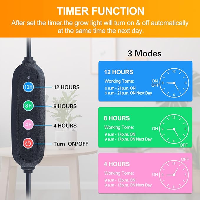 • Auto ON/OFF Every Day---4/8/12 Hr Timer. The plant grow light will auto ON/OFF every day. You can be easy to use this floor lamp grow light for tall houseplants, seed starting, seedlings, flowering.