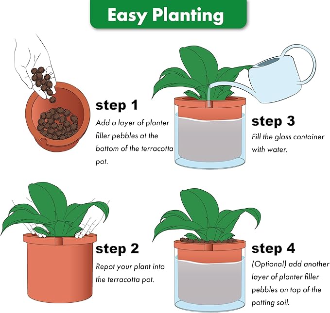 • Self-watering System: The bottom section of the white terracotta pot is unglazed, just fill the glass container with water to ensure plants will absorb only what they need through the terracotta pot walls.