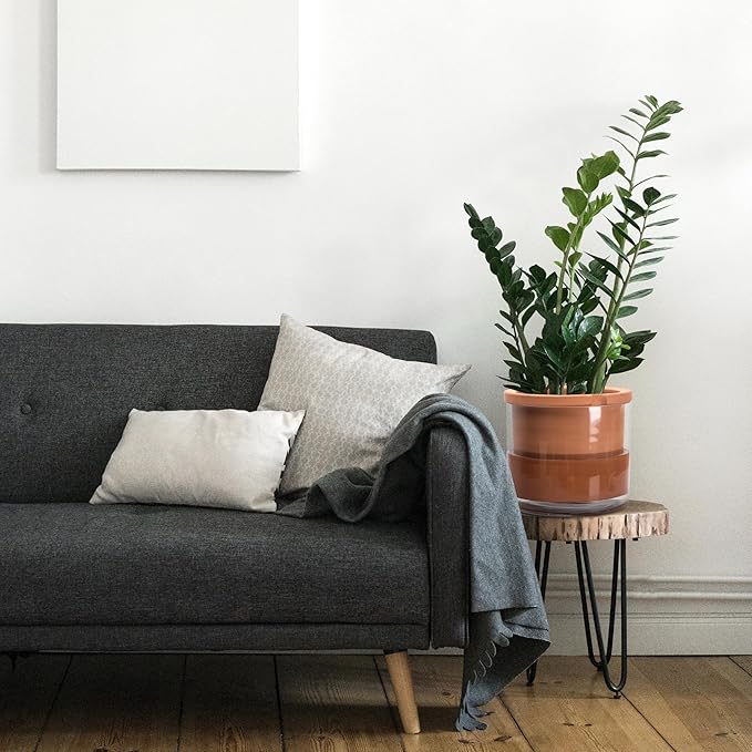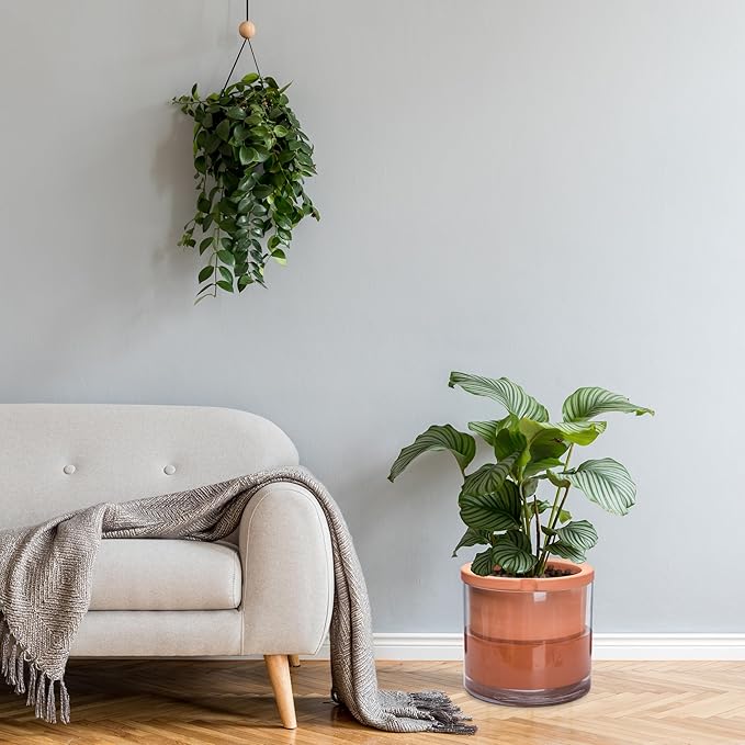 • Terracotta + Glass: Elegant modern design self watering plants pot with ingenious natural breathable terra cotta material and clear glass container. See the water surplus just from a glance.