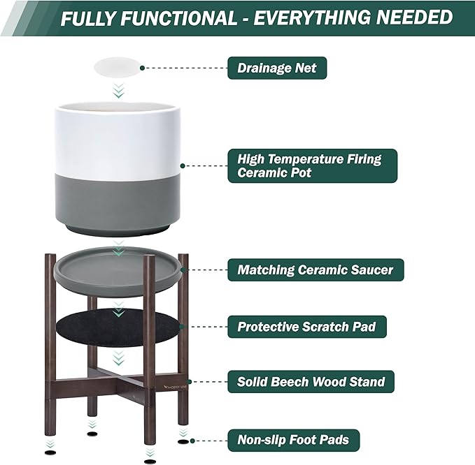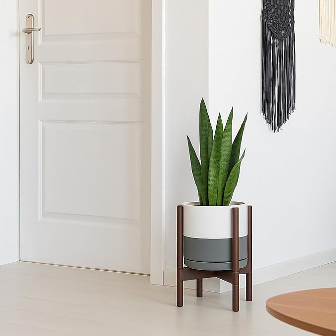 • A Complete Set: Mid-century ceramic planter, combined with a sculptural, solid wood stand that match perfectly together and looks great in anywhere.