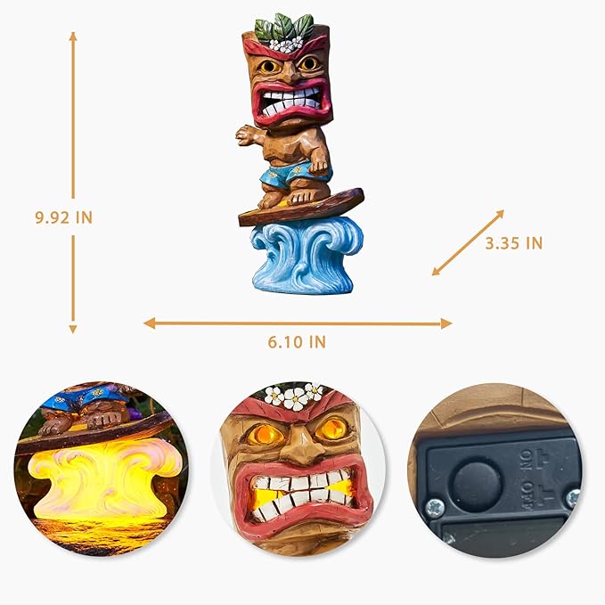 - 【PERFECT GIFT IDEA】The surfing tiki statue is 6.1x3.35x9.92inches in size, makes a perfect birthday/mother’s day/Christmas gift for family members, friends,tiki lovers or people who own a garden.It will light up their yard and bring a smile to their faces