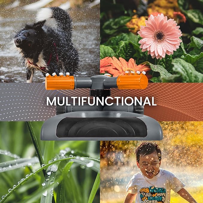 - Weighted Base: The Joeys rotating sprinkler for yard, is made of super strong ABS plastic. The weighted base keeps the sprinkler in place so it stays where you put it.