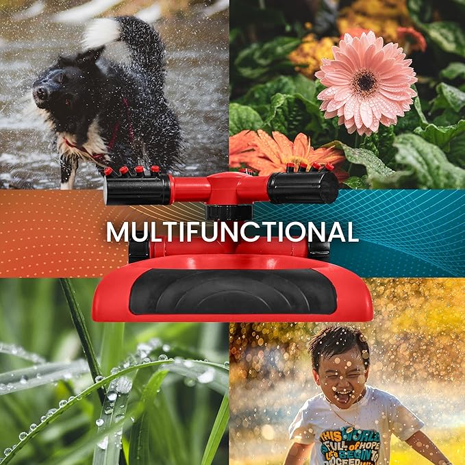 - Weighted Base: The Joeys rotating sprinkler for yard, is made of super strong ABS plastic. The weighted base keeps the sprinkler in place so it stays where you put it.