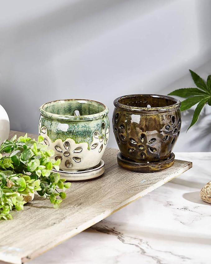 - 【 Perfect Air Flow and Drainage 】 The ceramic orchid pots side body have specially designed multiple holes for promotes air circulation and it has drainage hole in the bottom help for better drain and benefit for root grow healthy. Orchid pot with attached saucer could collect excess water keep your planting place cleaning.