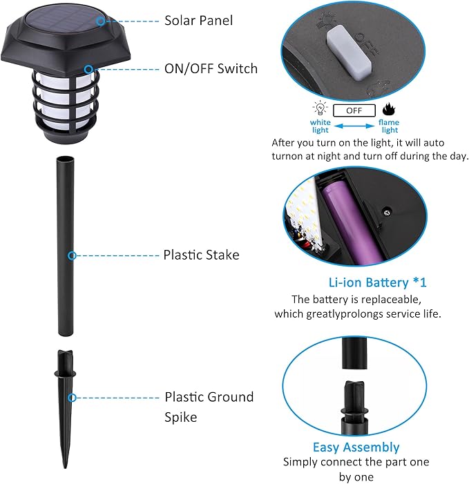 - 【Durable Solar Path Lights】Made of quality metal material, with rust resistant black coated finish, the stakes and poles are made of upgraded thicken ABS plastic, this solar flame light is durable for outdoor use.