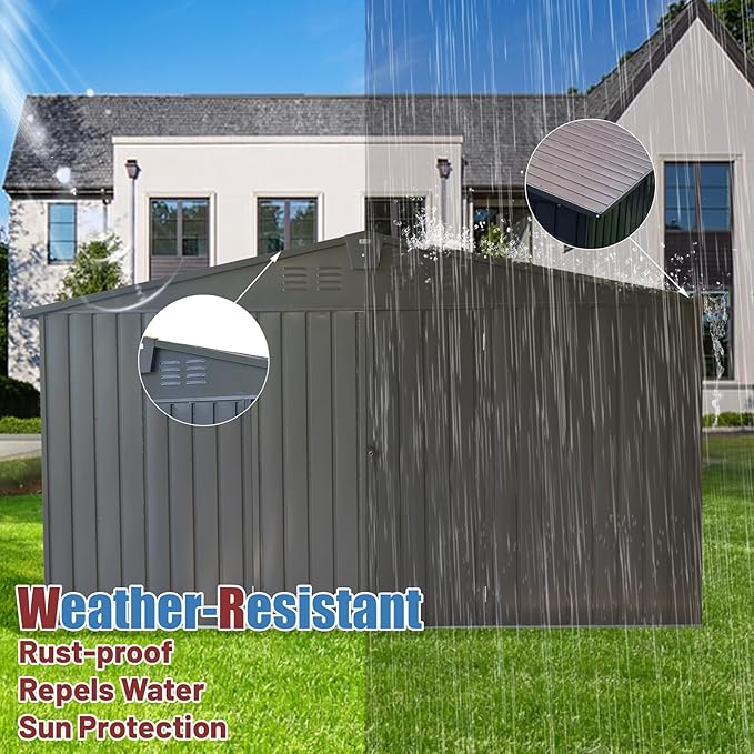- πDURABLE STURDY CONSTRUCTION: This storage shed adopts a thicker galvanized steel frame and the roof is supported by a sturdy metal beam structure, which is rust-proof, waterproof, UV-proof, and maintains the ability to resist bad weather for many years, dedicated to outdoor use. The column and the top are thickened to increase stability and durability.