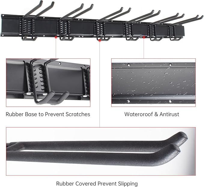 • 【Sturdy Rails & Coated Hooks】Garage storage rack hooks are made of high quality alloy steel which can load 350lbs,hooks with rubber coated that can prevent your tools from scratched or slipping.