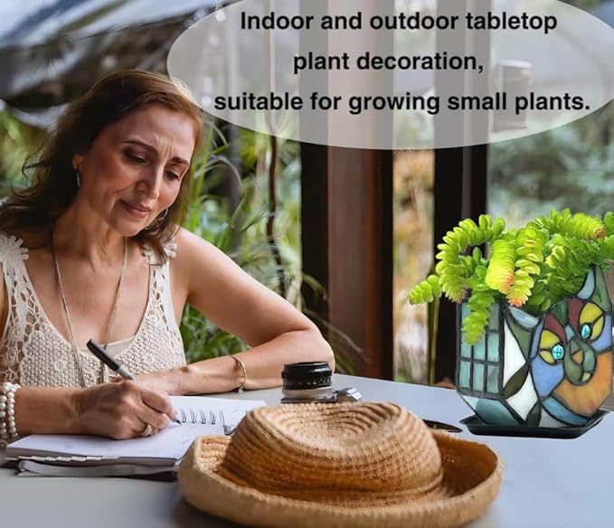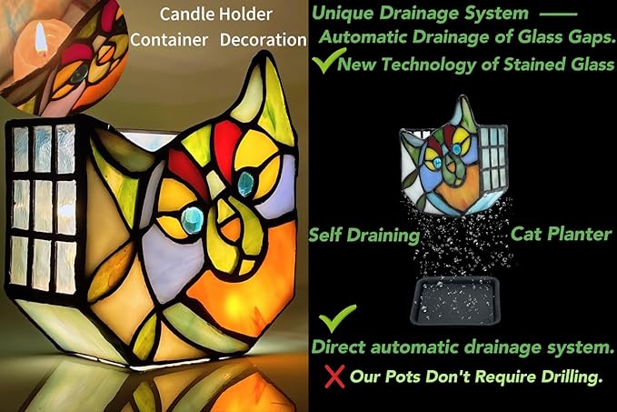 - MULTIFUNCTIONAL USE:Looking for a unique and beautiful way to display your plants ; Tiffany's Adorable Cat Stained Glass Planter;Made with a corrosion resistant pure copper frame; these pots are not only functional but also beautiful; Each flower pot is handcrafted and can be used for planting; dried flower arrangement; candle holder; pen or cosmetic brush holder and so on; Perfect for decorating your dining table; living room; or anywhere else you want to add whimsy and charm