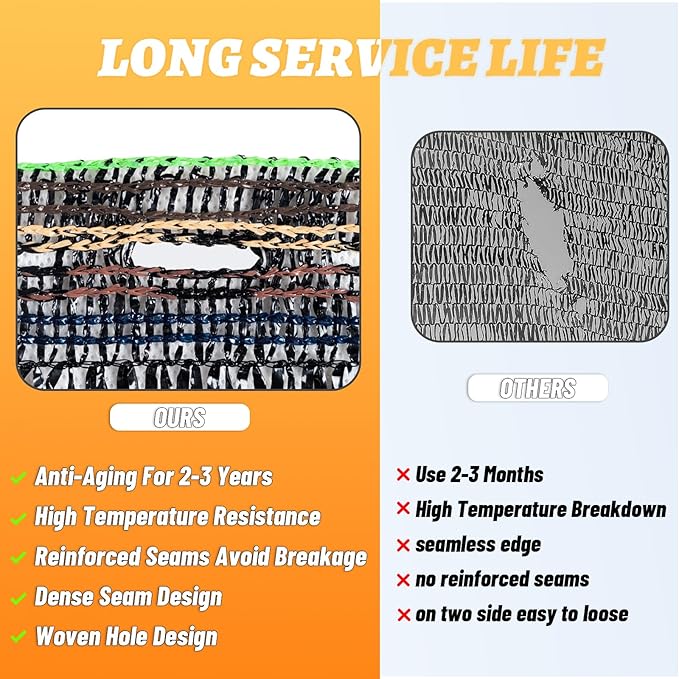 • 【Special Woven Hole Design】Made with new high density polyethylene (HDPE) material which Provides extra convenience for installation, garden shade cloth can block 40% of the sun and provide UV protection.