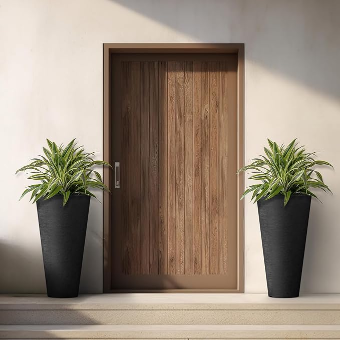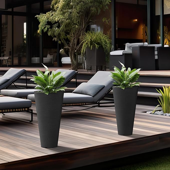 - Minimalist Chic - Elevate your space with these tall and wide planters, embodying sleek lines and a contemporary black finish—a defining trend in modern landscape design. The textured surface introduces an artistic touch to your garden, patio, office, living room, or front door area.