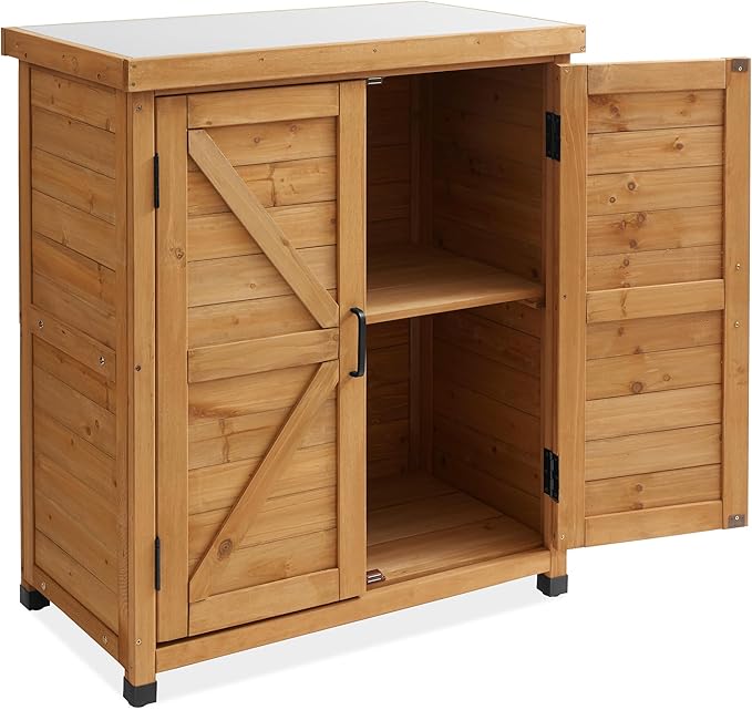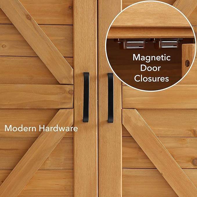 - Durable construction: The wooden garden potting storage cabinet is made from cedar wood. The galvanized metal steel top adds durability and protection against the elements, with resistance to rust and corrosion making it particularly suited for outdoor use. Magnetic door closures and ergonomic door handles provide for easy opening and closing of the cabinet doors.