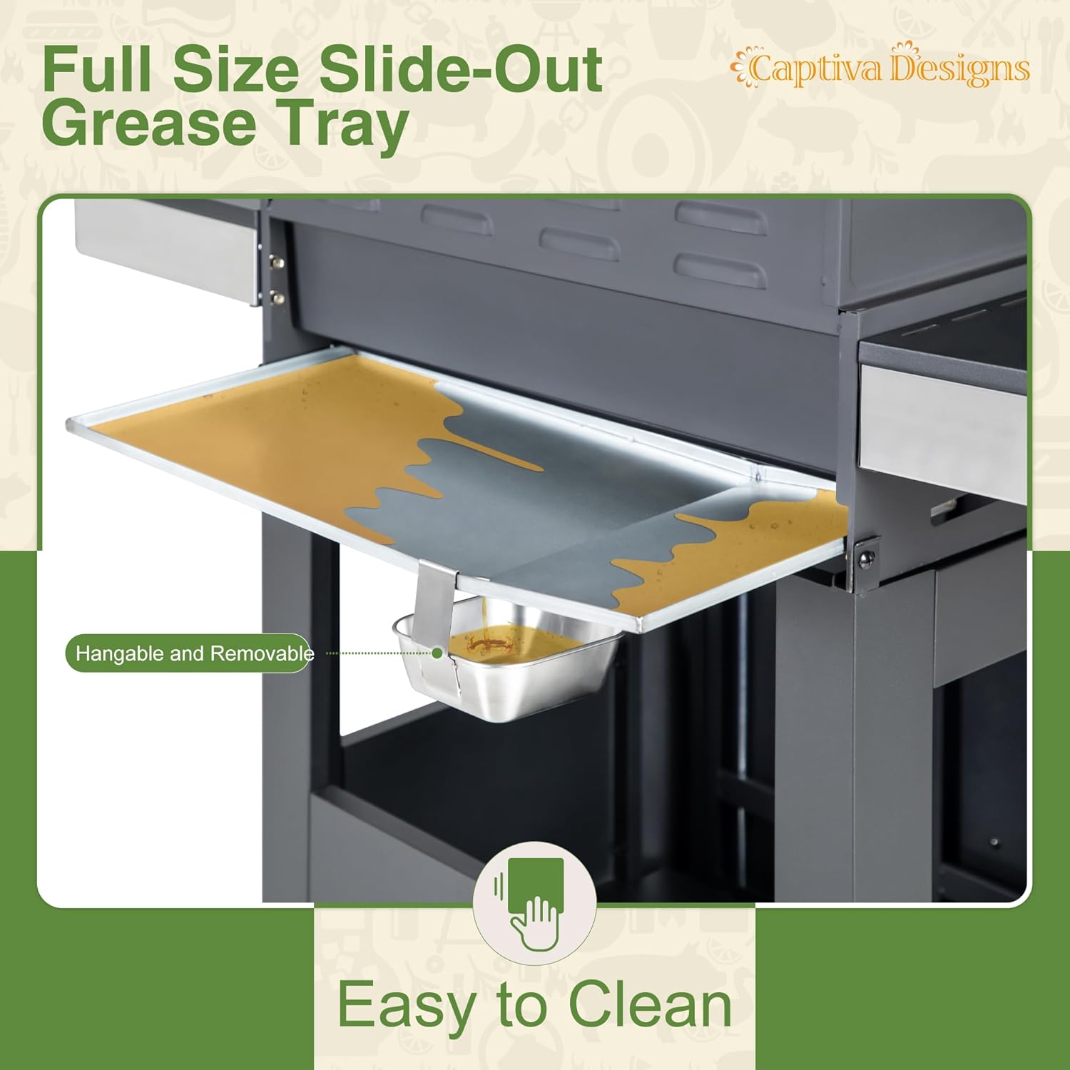 - 𝐄𝐚𝐬𝐲 𝐭𝐨 𝐂𝐥𝐞𝐚𝐧: Below the grill chamber body, there is a fullsized slideout grease tray, and it has been designed with a tilt so that the grease can flow directly into the hanging grease box below. The design of the slideout greasetray and the hanging grease box makes grilling cleaning much easier after BBQ time