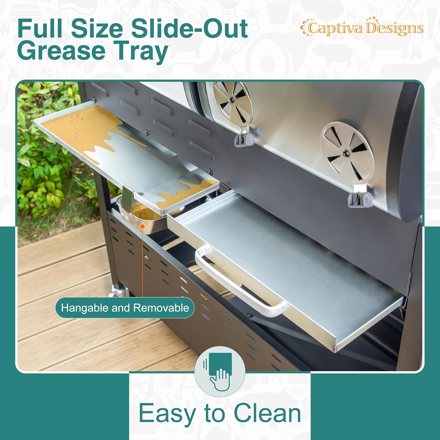 - 𝐄𝐚𝐬𝐲 𝐭𝐨 𝐂𝐥𝐞𝐚𝐧: Below the grill chamber body, there are a grease tray for propane gas grill and a ash tray for charcoal grill, and the grease tray has been designed with a tilt so that the grease can flow directly into the hanging grease box below. Both of them are designed full sized and slideout, which means grilling cleaning much easier after BBQ time