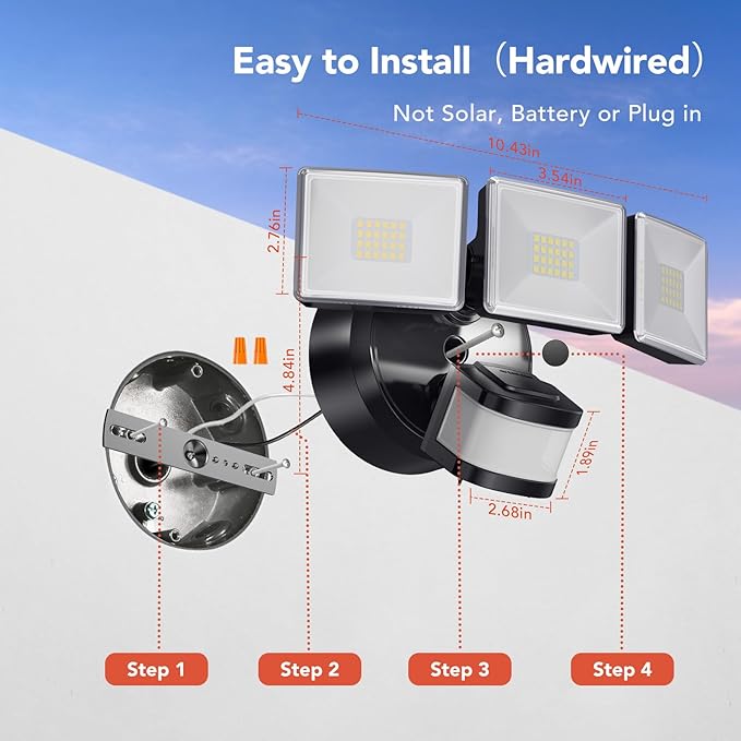 - 【180°/50FT Sensing Angle】Features a 180° wide range sensor, the outdoor flood light can meet the wide range of sensing angles installed on the eave corners. Not only can motion be sensed from the front, but also from the sides. At the same time, we have optional 10/20/30/50ft sensing distance options. The longer the detection distance, the higher the sensitivity of the sensor. You no longer have to worry about blind spots in security lighting.