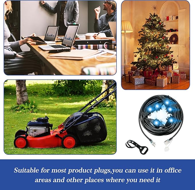 - Perfect multi-purpose extension cord. Our extension cord with multiple outlets is a must for household and working. You can plug in more devices in 1 cable. It is perfect for running home appliances in house, lighting up Christmas trees indoor and outdoor, holiday and party decorations. To use as stage backlines power board and power strip