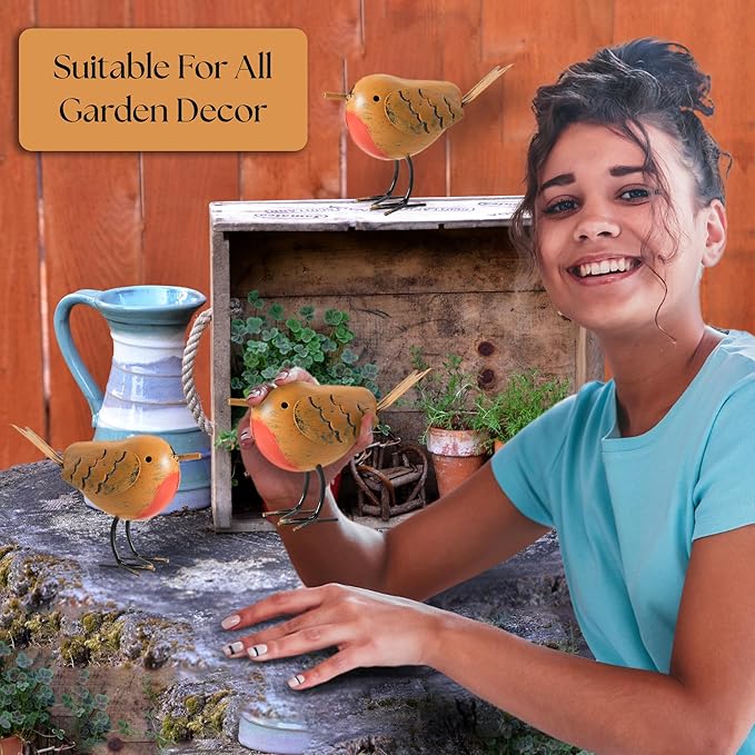 - Metal Birds; This set includes of 3 metal red robin bird ornament garden statues standing at 10cm x 16cm x 6cm the perfectmetal garden decor as animal lawn statues or yard decor