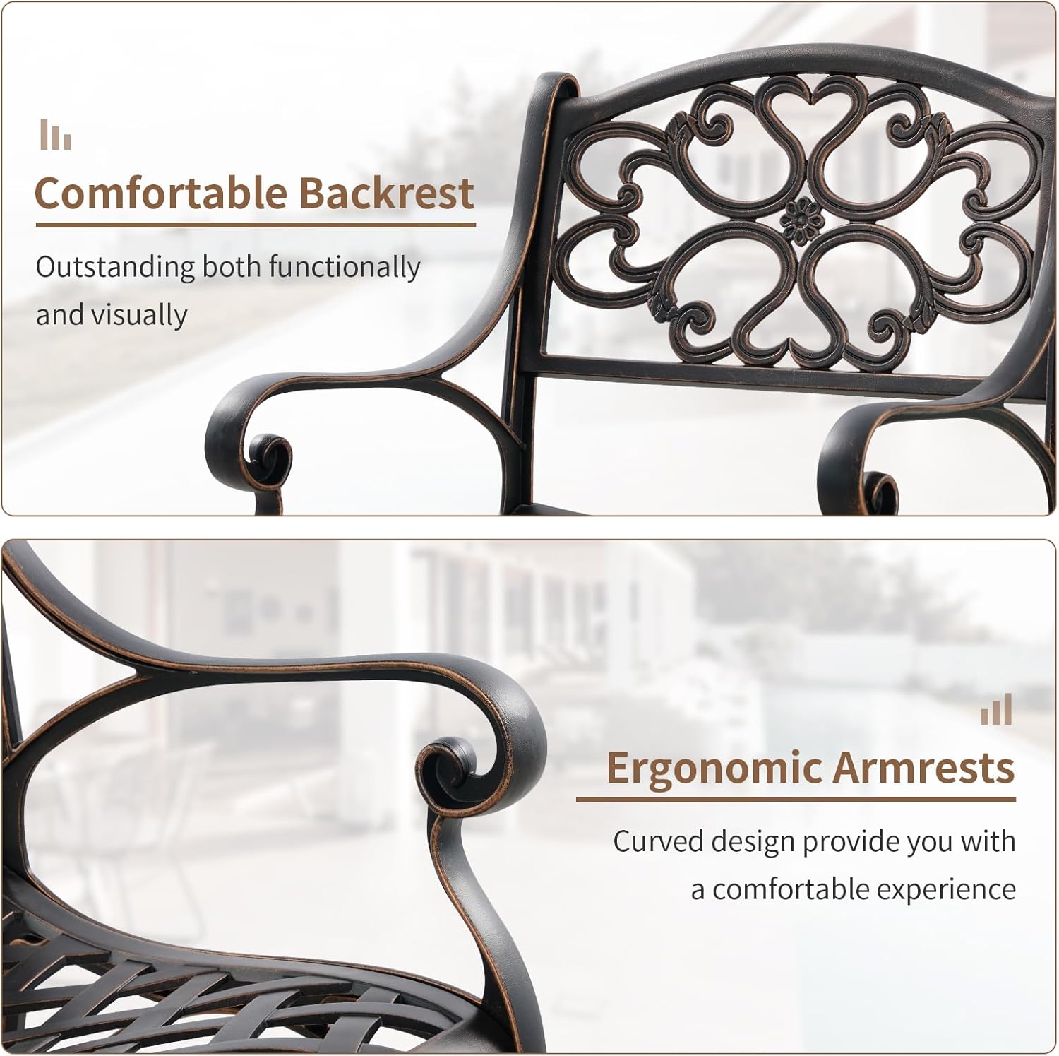 - 5 Piece Bistro Set Outdoor: Our dining set will meet all of your outdoor furniture needs. This bistro set includes 4 chairs and a round table with a beautiful bronze color, adding style to your space without sacrificing comfort. The chairs fit perfectly around the table for backyard family dining and picnics or take a rest.