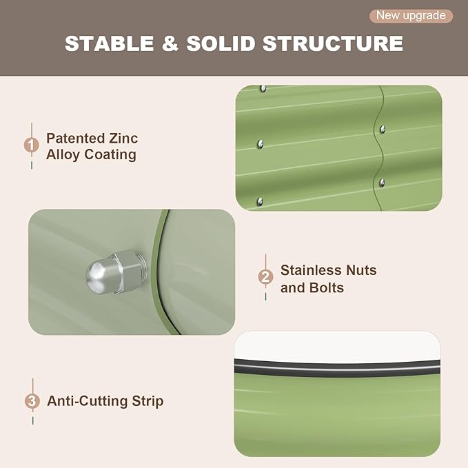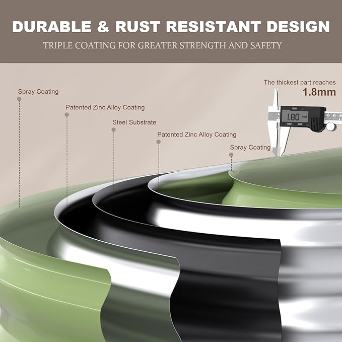 - DURABLE DESIGN: This galvanized raised garden bed, with a Zinc-Aluminum coating, is designed to enhance longevity and withstand various environmental conditions. The coating helps prevent oxidation and increases surface hardness. Its thickened design and oval shape ensure even pressure distribution, making it highly resilient against external forces. Reusable for years