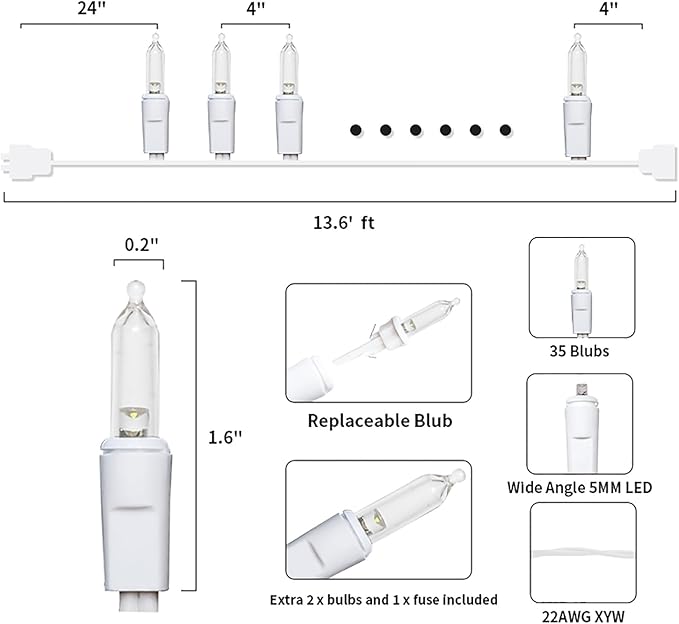 - 【Mini Christmas Lights Specification】: 1 Sets - white wire chritsmas light string includes 35 count warm white LED lights, total length 13.6ft, lights length 11ft and each led is 4 inches apart, 24 inches lead wire, 4 inches end connector (Extra 2 x bulbs and 1 x fuse included)