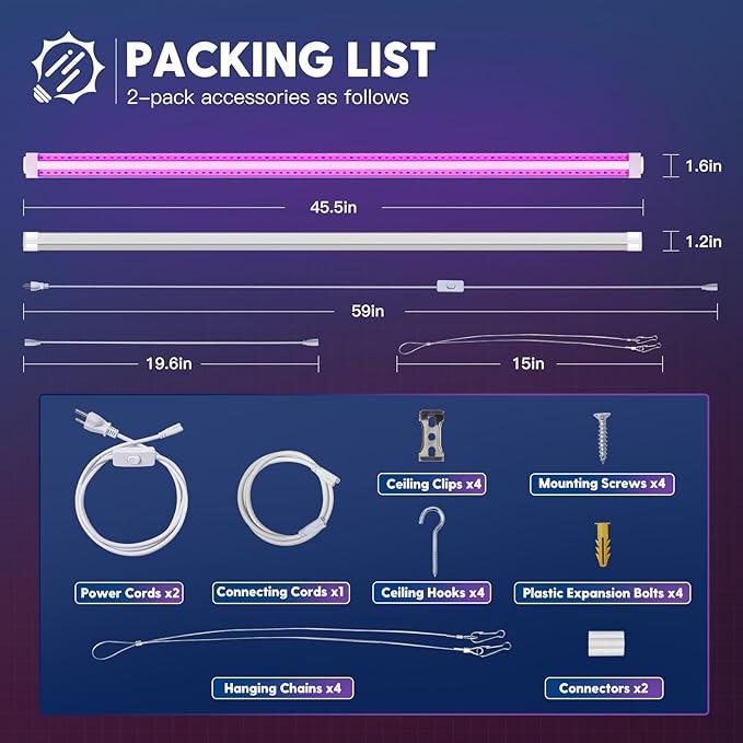 - Easy Installation: Two installation ways—Hanging or Mounting, with included wire rope hooks, clips, connectors, hooks and screws, you could install the grow lights for seed starting by yourself in minutes