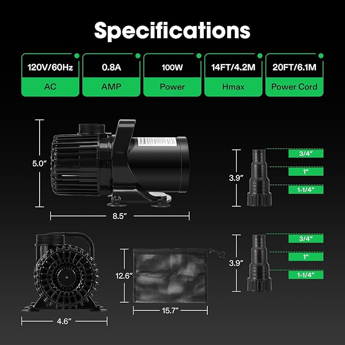 - Energy Saving with Low Noise: The pump utilizes new drive motor technology that is ultra-quiet (30-40db), consumes less power (100W), and has a higher output (1600GPH/6000LPH) than other pumps; It is absolutely ideal for use in ponds