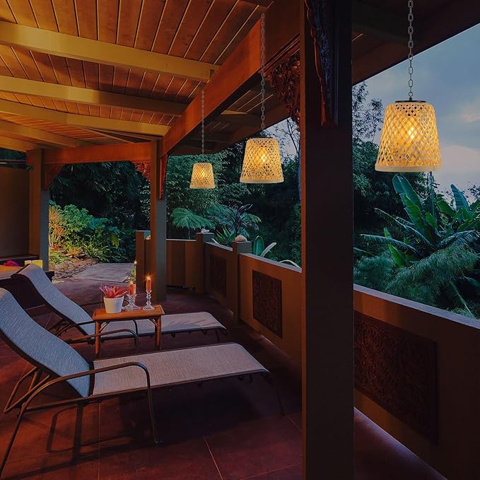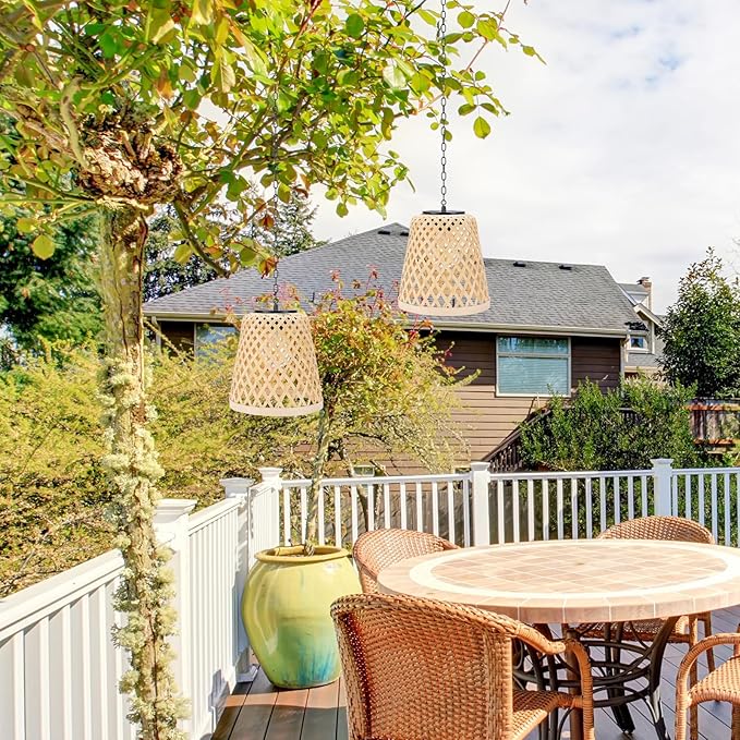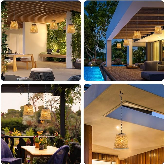 - 【Handmade Natural lanterns】-- Add a rustic touch to your outdoor decor with our handmade rattan woven lanterns featuring an Edison bulb. The package includes a set of 2 solar pendant lights that are perfect for your yard, patio, gazebo, garden.