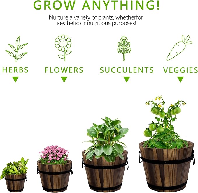 - 【Durable Material】Our whiskey barrel planter is made of antiseptic wood, ensuring great strength and durability,which means it can withstand harsh sunlight and harsh winters,you can use it indoors and outdoors freely.