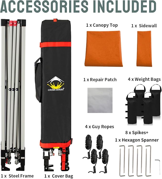 CROWN SHADES 10x10 Pop Up Canopy with 1 Side Wall - Beach Tent with One Push Setup - Outdoor Sun Shade for Events, Parties, Camping - Gazebo with STO-N-Go Cover Bag (Orange)