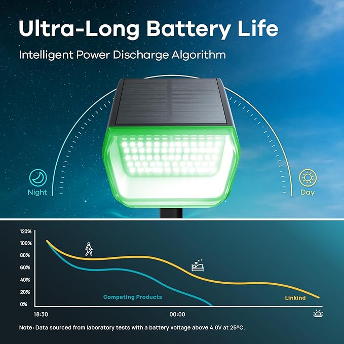 - Enhanced Multicolor Design: Linkind’s solar lights outdoor feature 10 color modes, including Red, Pumpkin-Orange, Yellow, Green, Blue, Indigo, Purple, 2700K warm white, 6500K cool white, and a dynamic Color Cycle mode. Switch effortlessly with a single click, and hold for 3 seconds to turn off