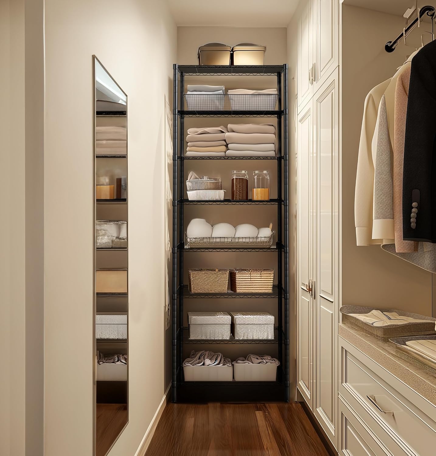 - OUR SERVICE - Your satisfaction is our pursuit, we provide smart device for you to easily prevent rack from falling down. Any problem you can contact us and 100% money back for any reason you are unsatisfied with Finnhomy 8 shelves rack.
