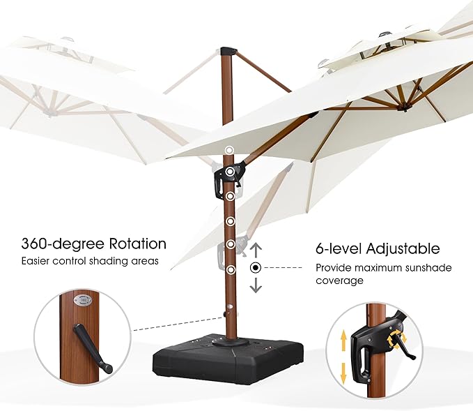- Large area shade: The size of this patio umbrella is 11' X 11', unique handle design and crank system, 6 height and angle to choose, 360 degree rotation for easier shading area control