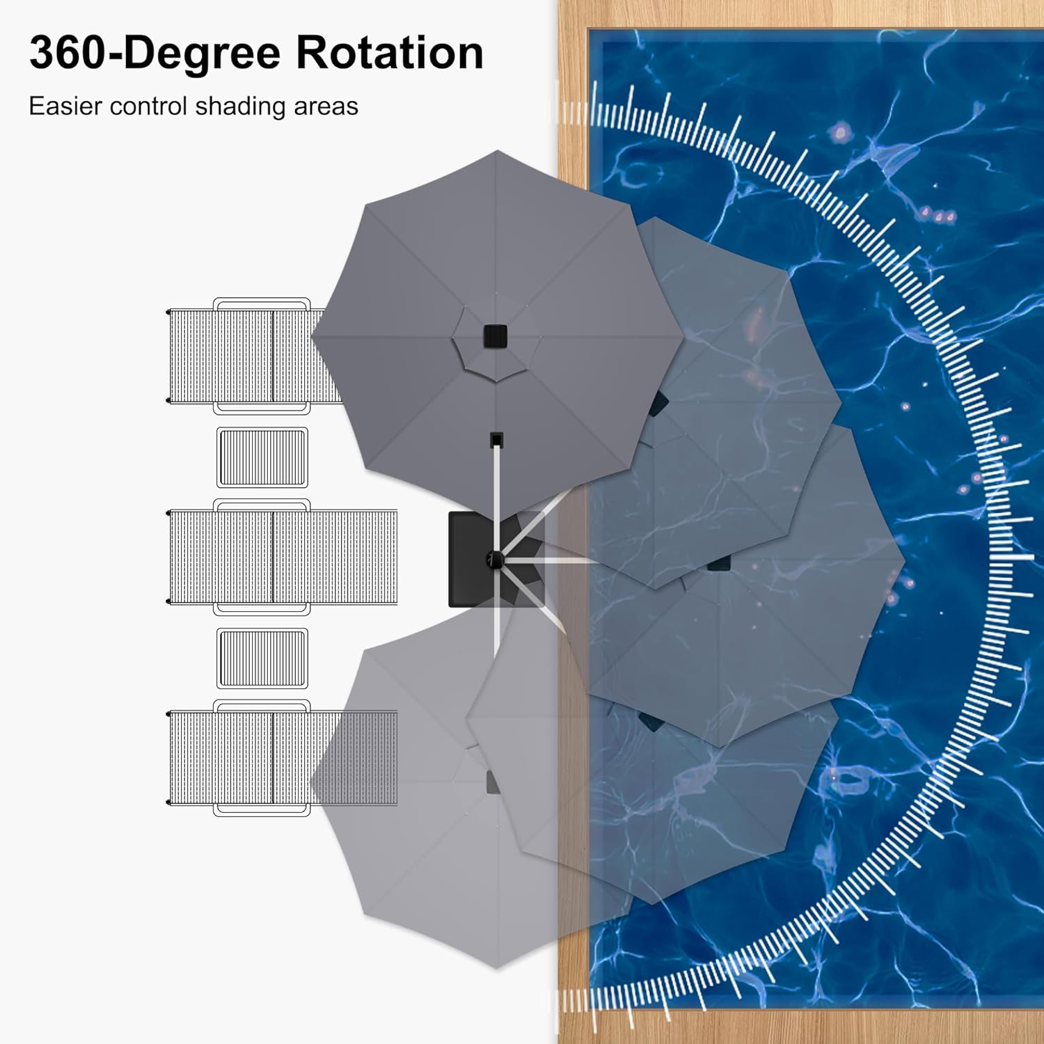 PURPLE LEAF 10ft Patio Umbrella With Base Solar powered LED Cantilever Umbrella with LED lights Windproof Outdoor Offset Umbrella for Garden Deck Pool Patio, Grey