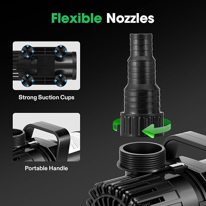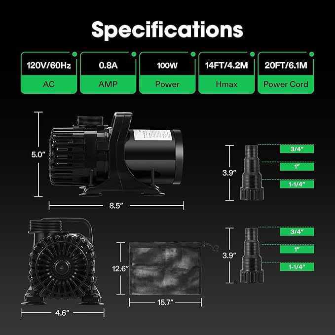 - Energy Saving with Low Noise: The pump utilizes new drive motor technology that is ultra-quiet (30-40db), consumes less power (100W), and has a higher output (1800GPH/6750LPH) than other pumps; It is absolutely ideal for use in ponds