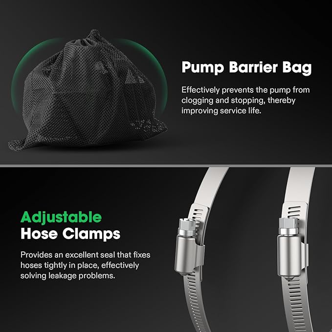 - Thoughtful Design: The detachable filter and pump barrier bag are designed to effectively prevent the pump from clogging and stopping, thus significantly improving its service life; With a 20FT power cord, the pump is incredibly easy to use; Plus, the adjustable hose clamps provide a secure seal to hold the water pipe tightly in place