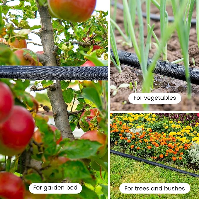 - 【Easy to Create an Irrigation System】The flat soaker hose can easy to place or move in your garden, which can be easily connected to a faucet or other hoses, and you can also connect it with a timer. You only need to install the hose, turn on the switch and it will automatically add water to the plants, making your irrigation easier and more effective. Easy installation makes it easier for you to build your irrigation system.