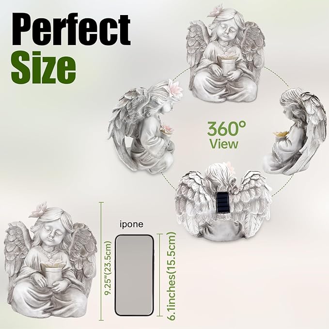 - Angel Garden Statues for Outside: This angel garden statues light is made of high quality resin material, IP44 waterproof and fade resistant could work well even in heavy rain or snowstorms. The angel solor lights is very bright, adds a distinctive charm to your yard.