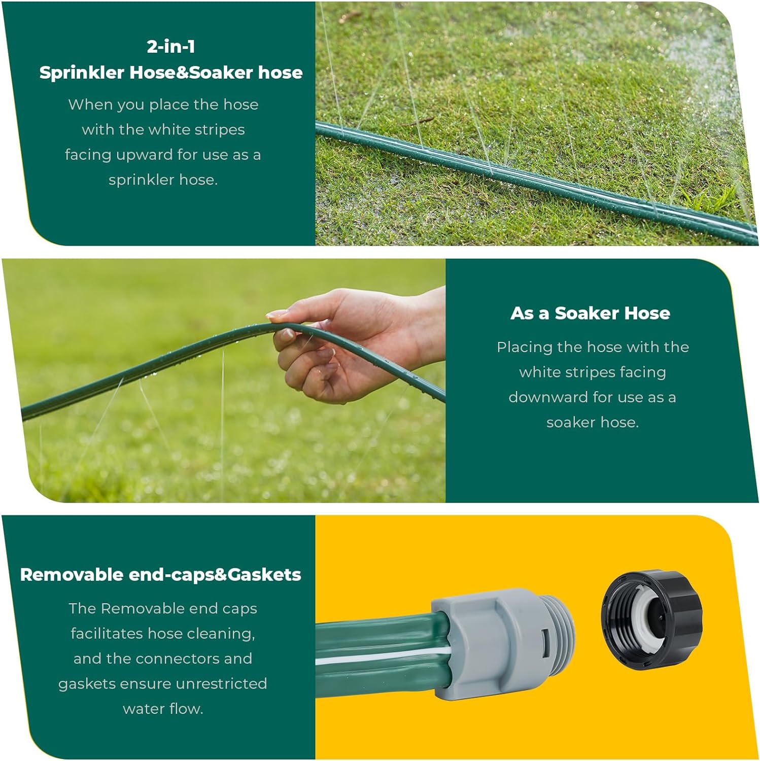 - CONVENIENT USAGE: The sprinkler hose's lightweight and easy-to-handle design makes it flexible for both deployment and storage. It comes with detachable end caps and metal garden stakes, where the removable end caps aid in connecting additional hoses and facilitate hose cleaning. Proper use of the metal garden stakes helps secure the hose layout and prevents kinking