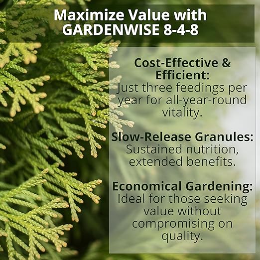 - đź’µ ECONOMICAL LONG-LASTING FORMULA: GARDENWISE 8-4-8 is not only cost-effective but also incredibly efficient, requiring just three feedings per year. Its slow-release granules ensure sustained nutrition and long-lasting benefits, making it an ideal choice for gardeners seeking an economical solution for maintaining their plants' health and vibrancy throughout the year.