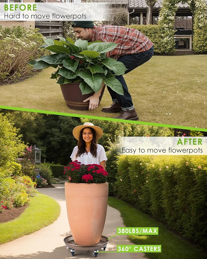 - 🌷【Widely Used Indoors/Outdoors】-plant roller has a good load-bearing capacity, not only can be used as a plant cart, but also can help you carry heavy objects, such as furniture, wine barrels, free-standing stoves, etc. Ideal for gardens, yards, courtyards, outdoor environments. Make your relocation very easy!