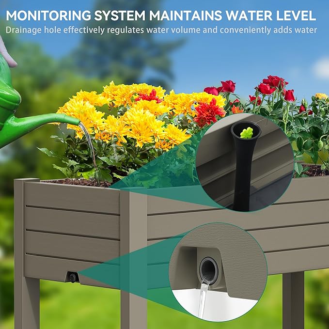 - Versatile Design: Our elevated garden bed adapts to fluctuating water levels with a float, ensuring optimal plant hydration; Side drainage holes efficiently remove excess water, while the central divider separates soil and water for moisture control