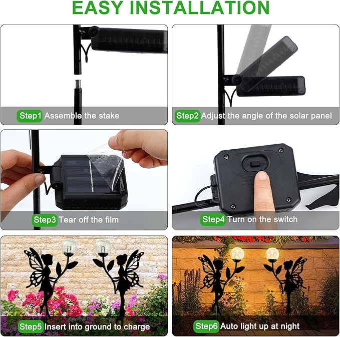 - Easy to Use: Installing the solar garden lights outdoor is effortless; Just attach the ground garden stakes to the fairy statues and insert them in a location that receives ample sunlight during the day, then let the sun do the rest