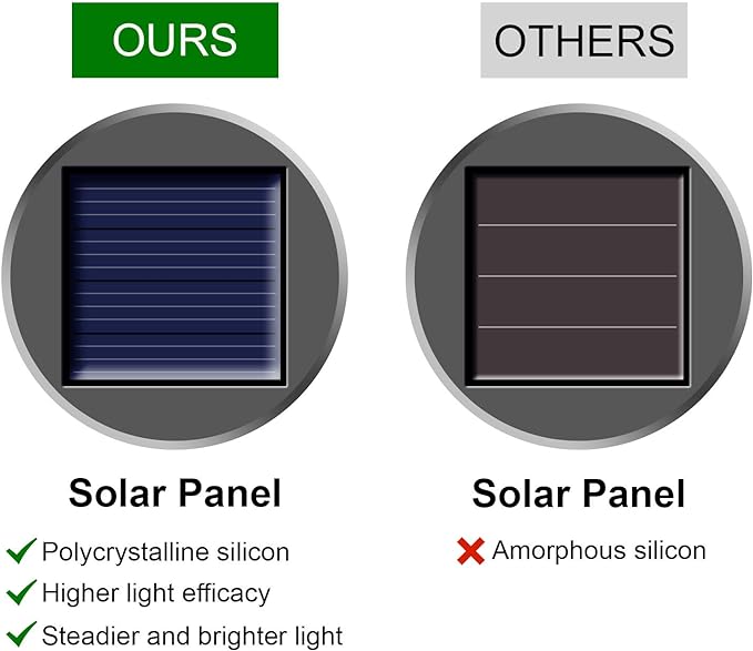 - 【Better Solar Panel】Unlike other outside solar hanging light panels made of Amorphous silicon, Our solar lights are made of Polycrystalline silicon which has higher light efficacy. With the same charging hours, our solar panels can save more electricity in the daytime and casts brighter and steadier glow at night.