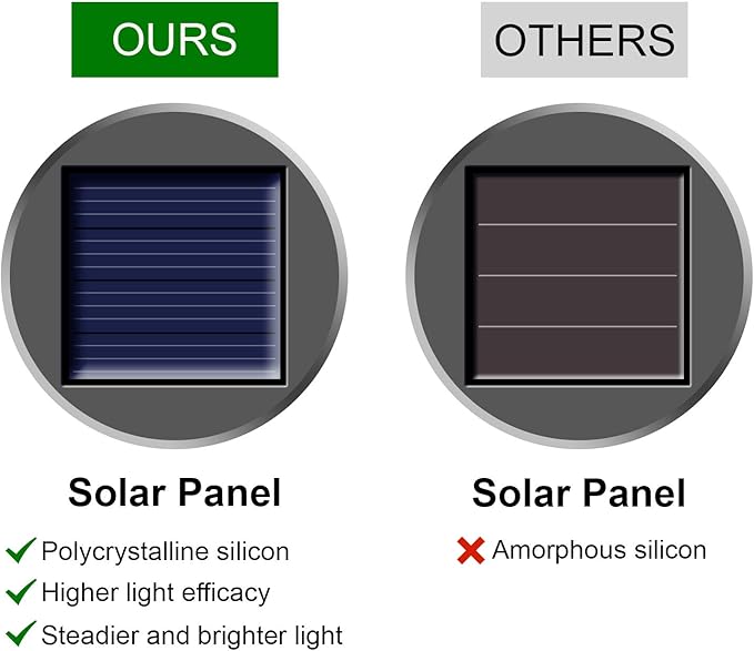- 【Better Solar Panel】Unlike other outside solar hanging light panels made of Amorphous silicon, Our solar lights are made of Polycrystalline silicon which has higher light efficacy. With the same charging hours, our solar panels can save more electricity in the daytime and casts brighter and steadier glow at night.