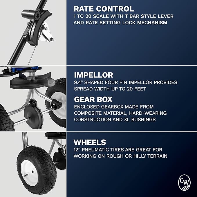 - Spread to Your Needs: Spread width is approximately 20 feet, with an adjustable-rate control from a 1 to 20 scale, and includes an adjustment plate for left and right pattern adjustment.