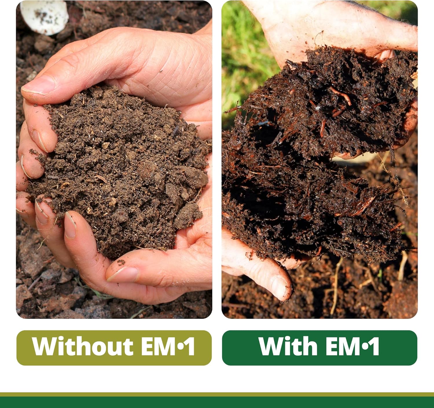 - INCREASES ACTIVITY IN SOIL. Our EM-1 compost accelerator is a liquid concentrate containing a broad spectrum of beneficial organisms that harmoniously convert organic material into humus while binding nutrients to create a food source for plants.