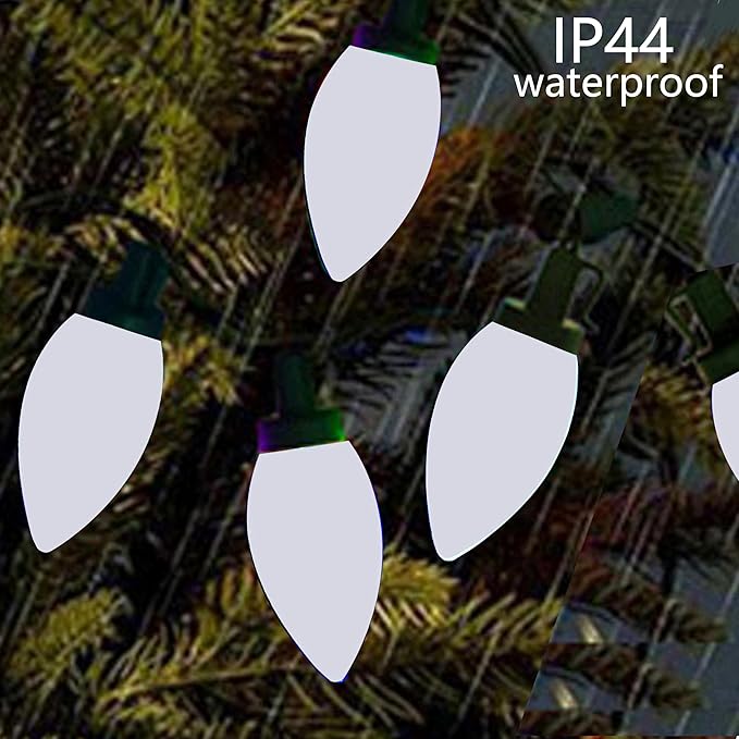 - [Warm Decoration] C9 Christmas lights can be used outdoor and indoor. It's a very nice Christmas decoration, can be used as Christmas Tree, Balcony, Bedroom, Patio, Garden, Holiday, Party. Light up cool white c9 lights, LED light through the c9 smooth bulb, the light is soft and fairy, very beautiful. LED lights are low heat generate, bring you a relax.