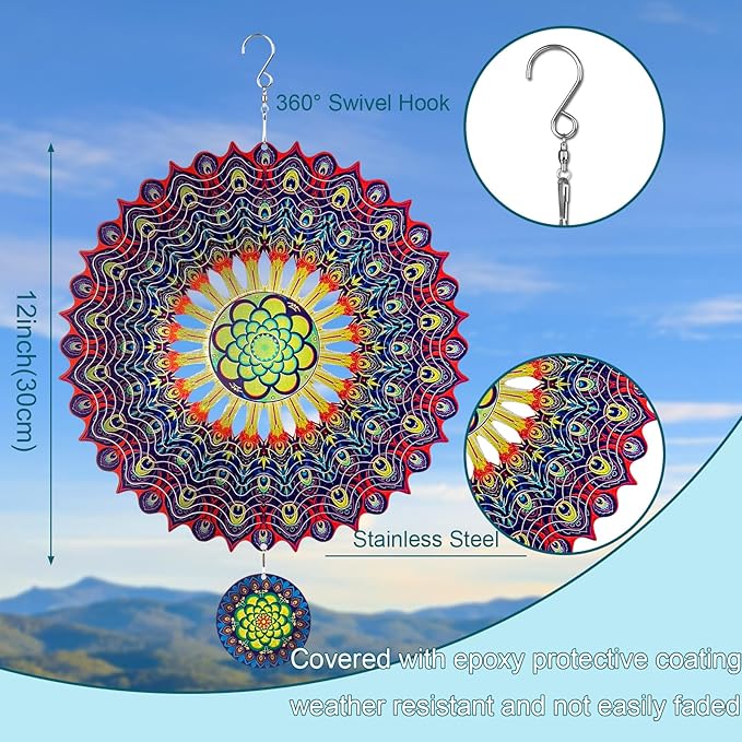 - PERFECT SIZE AND 360° ROTATING: Measuring 12"W x 12"H.Our portable art wind spinners easy to unfold, twist and hang,The convenient metal S-shaped swivel hook will help us experience the mesmerizing beauty of our wind spinners as they gracefully rotate 360 degrees with the slightest breeze. This gentle motion creates a captivating display, adding a sense of tranquility and relaxation to your outdoor or indoor space.